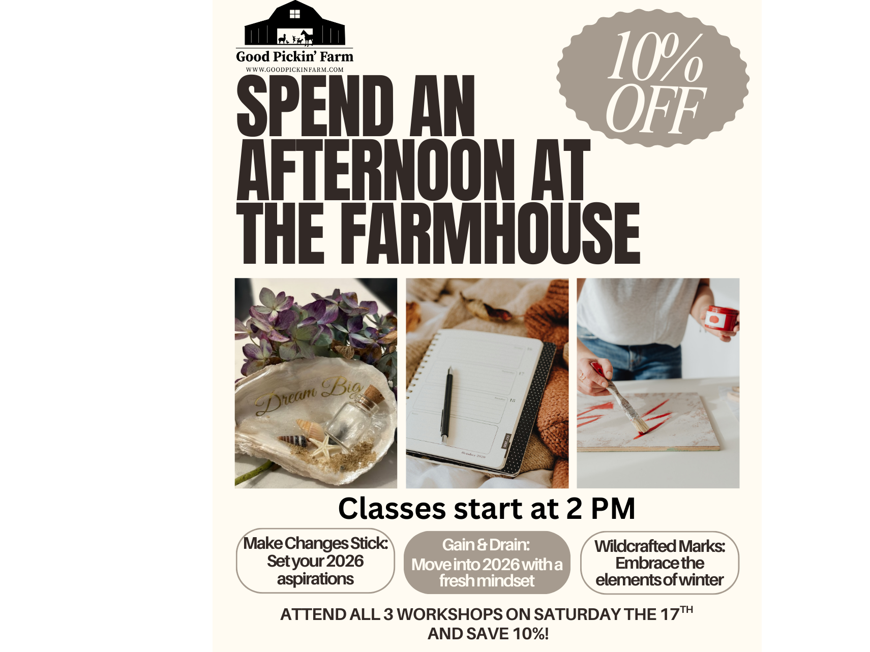 Special Offer: Attend all three workshops and enjoy 10% off for a full afternoon of intentional wellness and creative rejuvenation.