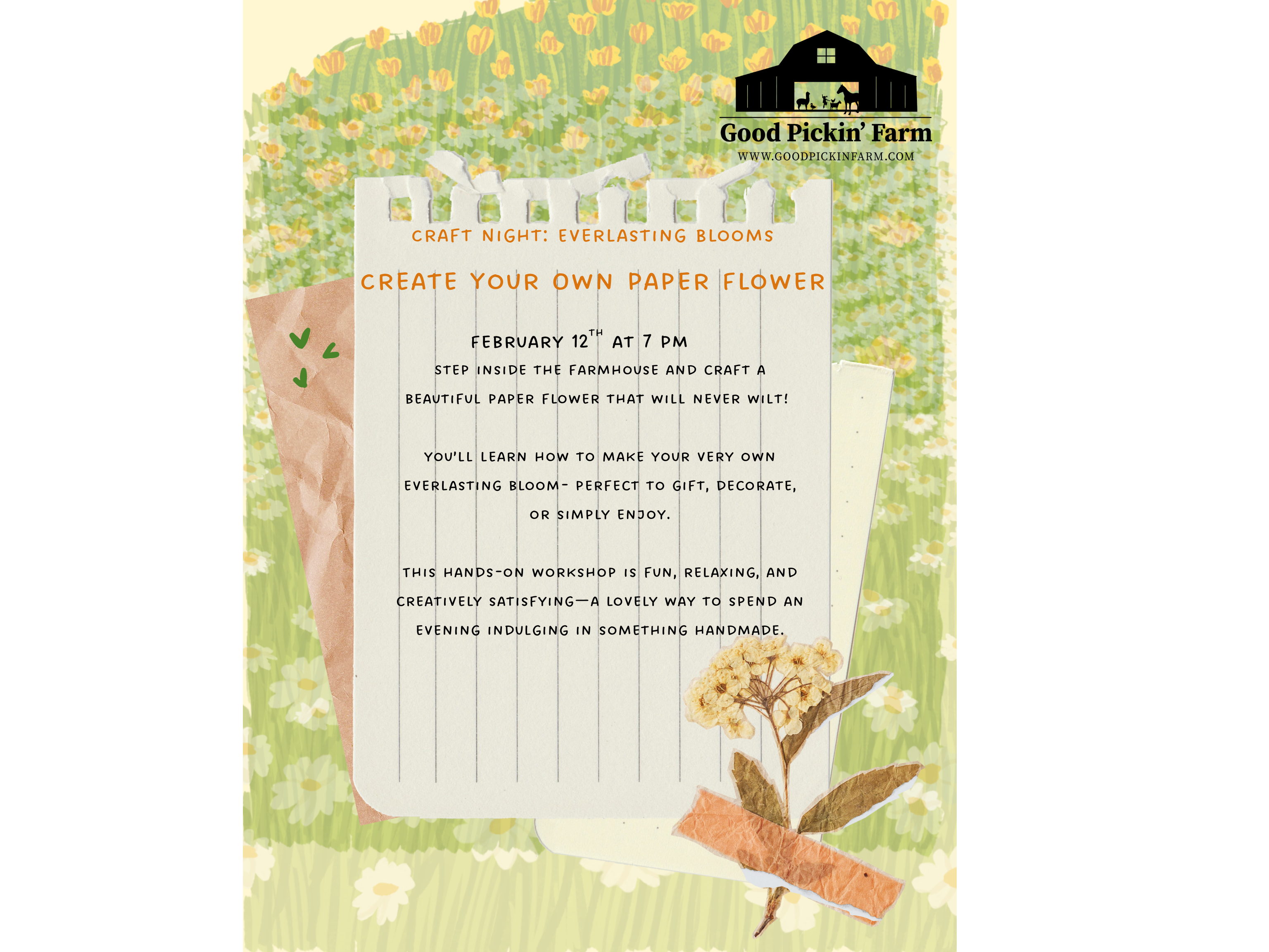 Step inside the farmhouse and craft a beautiful paper flower that will never wilt! Led by our talented leader, you’ll learn how to make your very own everlasting bloom—perfect to gift, decorate, or simply enjoy.