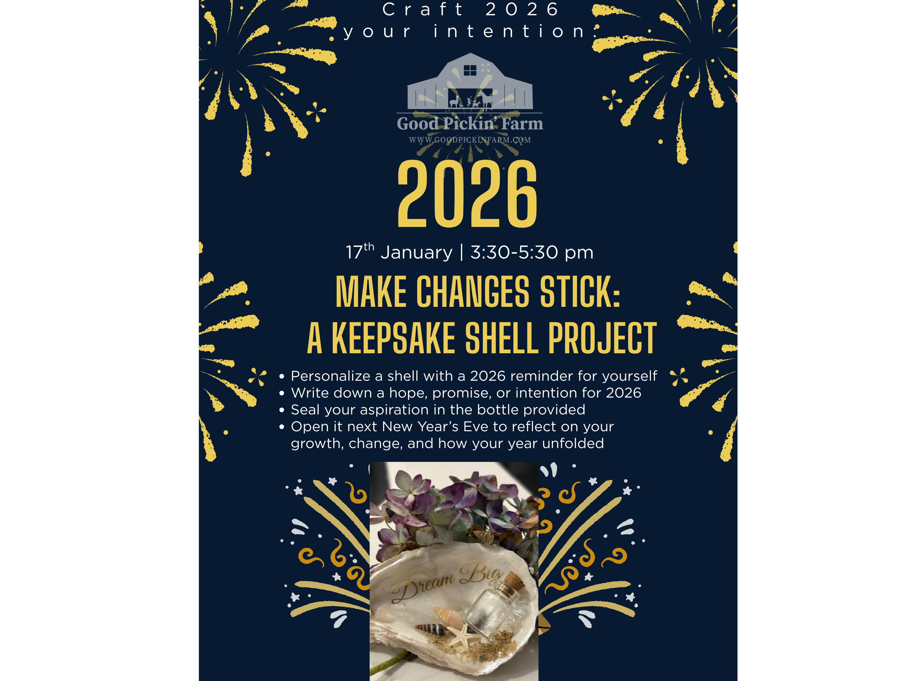 Personalize a shell with a written reminder for 2026, then layer in a hope, promise, or intention for the year ahead. Seal your aspiration in the bottle provided. Open it next New Year’s Eve to reflect on your growth, the changes you made, and how the year unfolded.