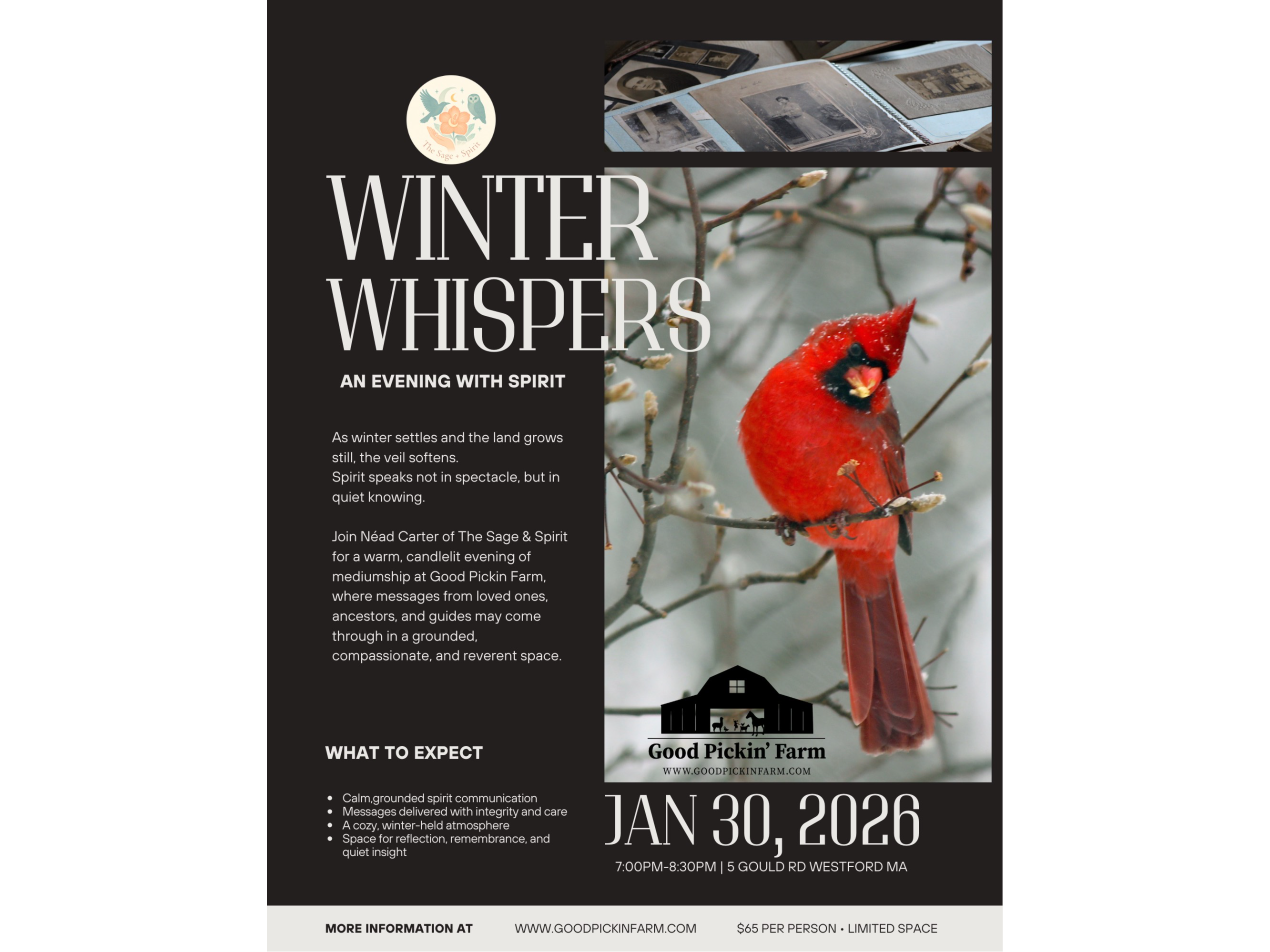 Winter Whispers is an intimate psychic medium gallery with Néad Carter of The Sage & Spirit, held at Good Pickin Farm. This evening is designed to be warm, grounded, and respectful, offering a calm space for Spirit communication and meaningful connection.